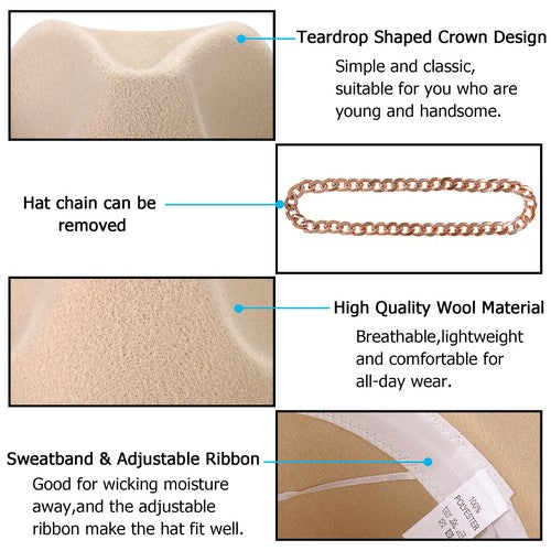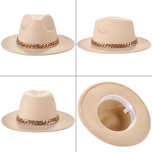 Beige Wide Brim Fedora with Cuban Chain Jazz Wool Felt Hat | Size M-L - Boniskiss