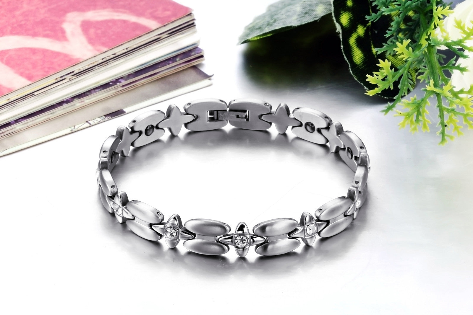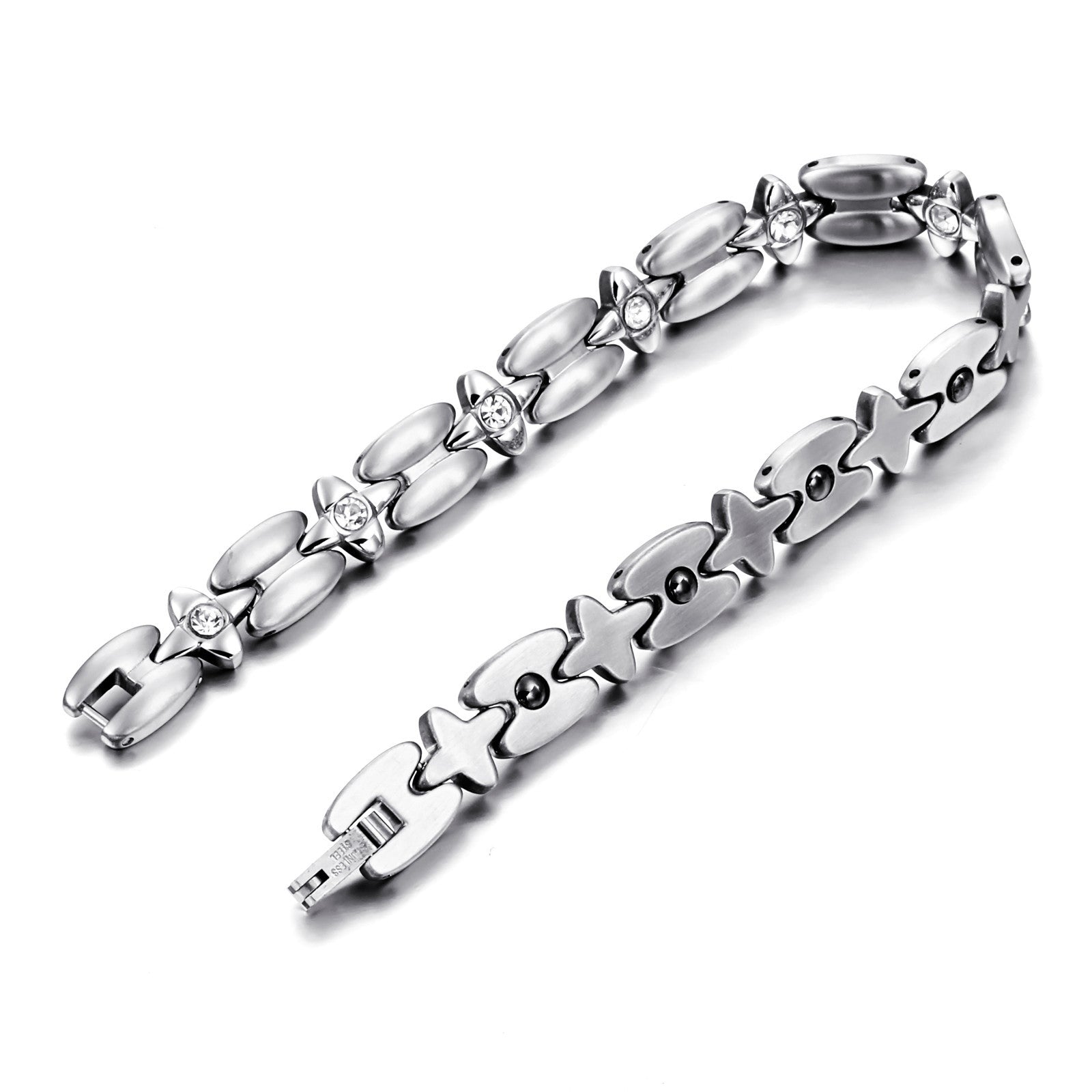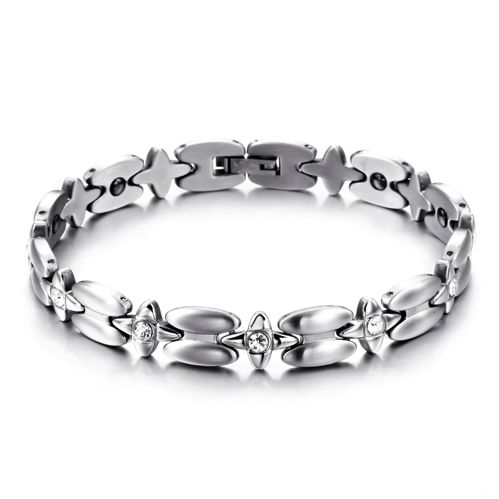 Boniskiss New Silver Stainless Steel Magnetic Stone Cz Cross Chain Link Bracelet 8 Inch for Women