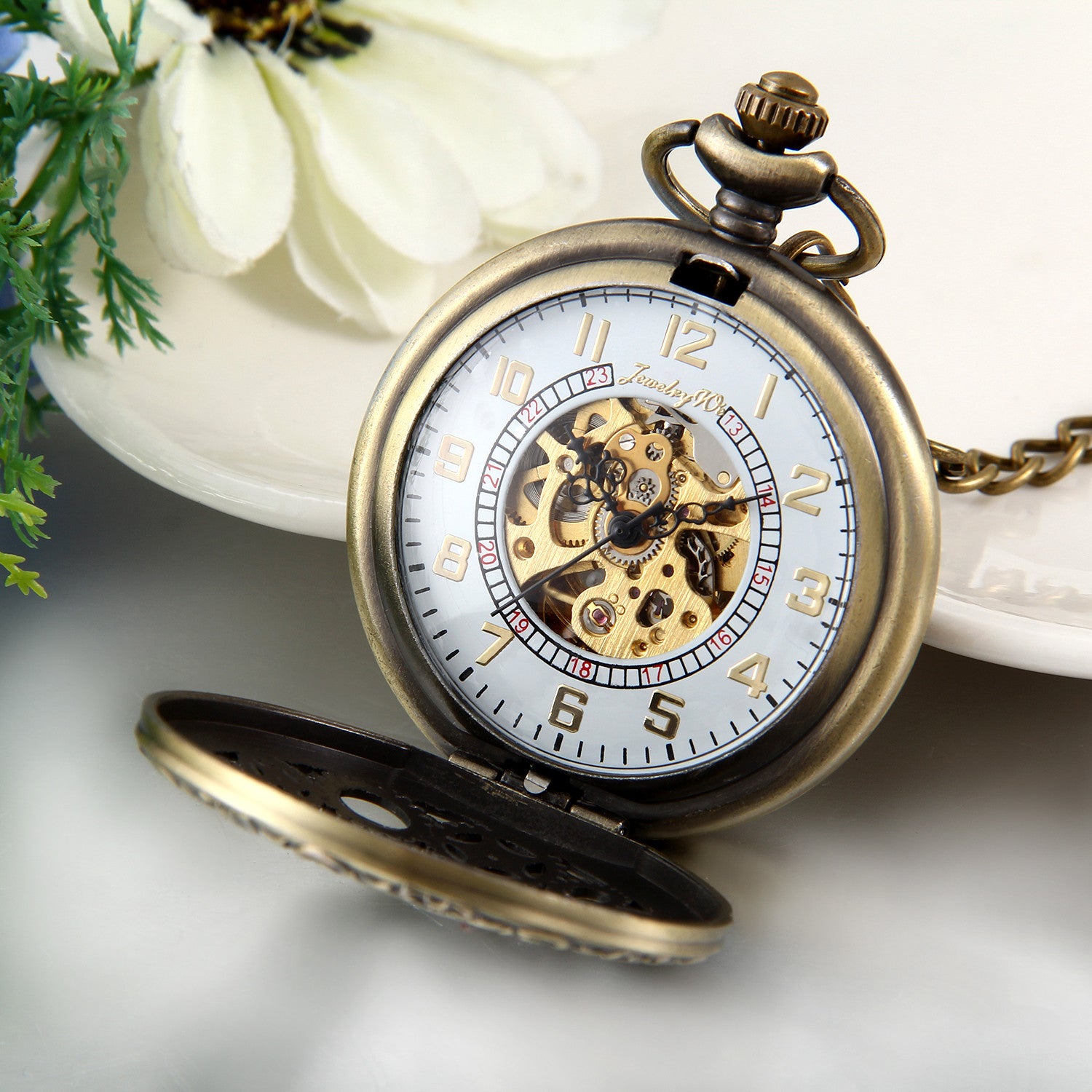 Boniskiss Classic Antique Half Hunter Metal Hollow Gear Wheel Skeleton Hand Wind Mechanical Pocket Watch with Chain