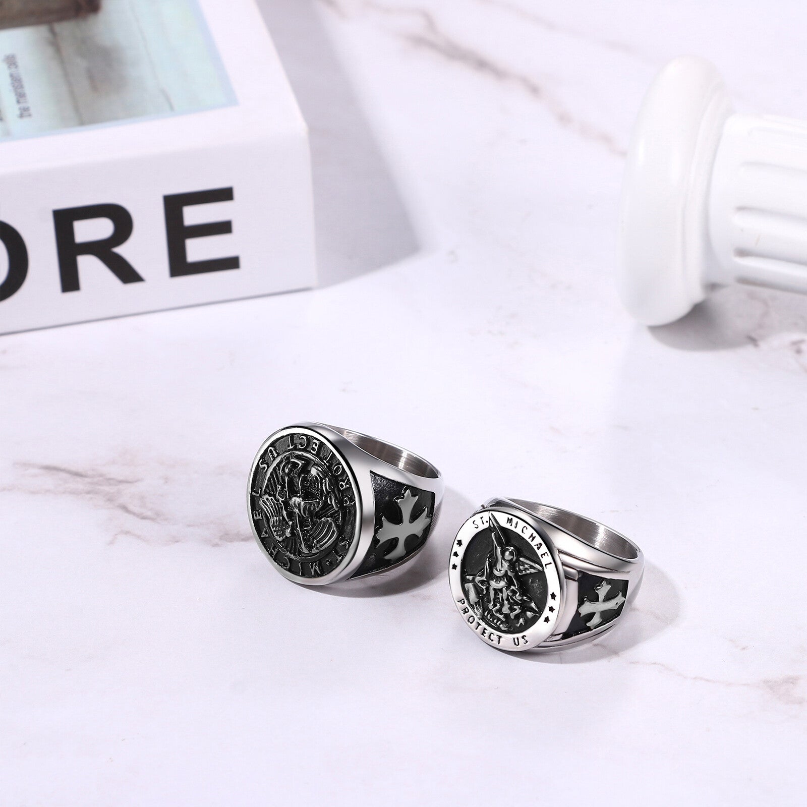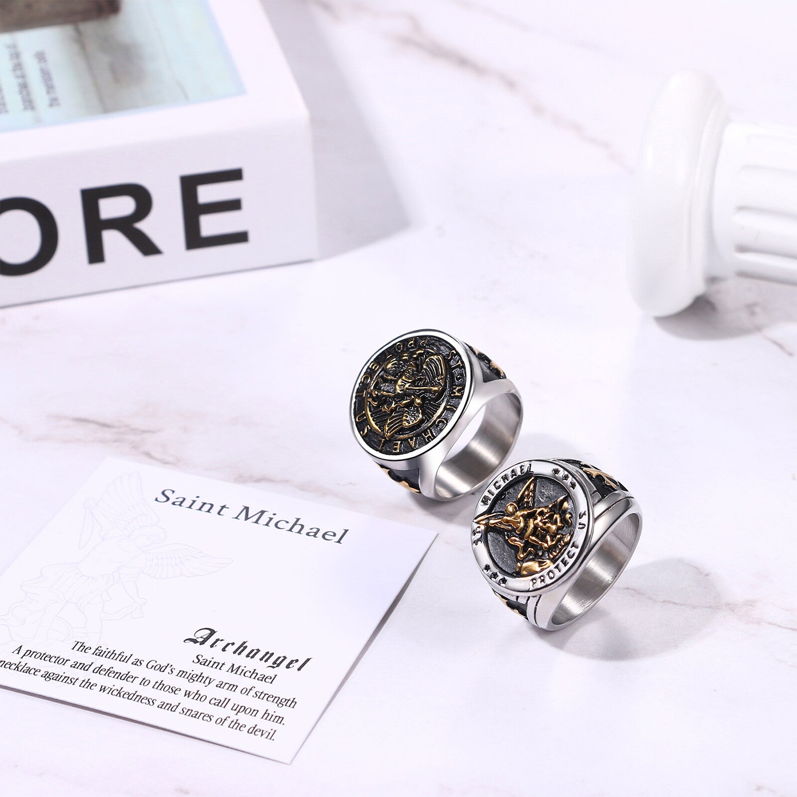 Boniskiss Michael Angel Ring for Men - Religious Amulet Signet Stainless Steel Band Ring