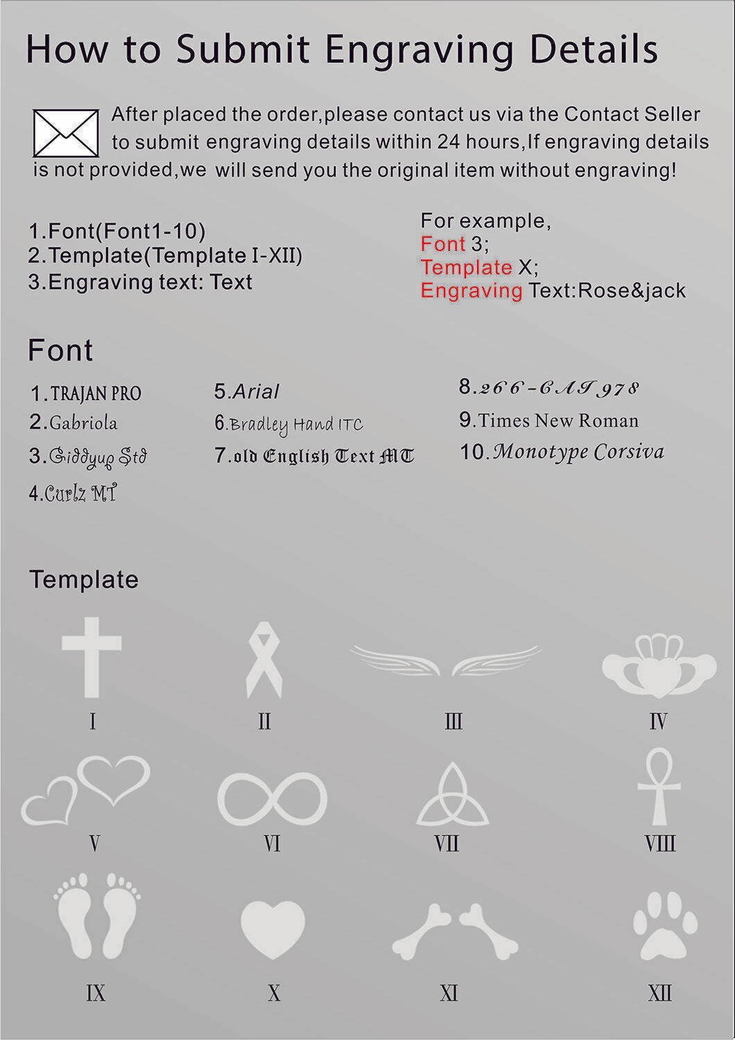 Please click the "Chat" button in the lower right corner or send the engraving content to our customer service at boniskiss@gmail.com