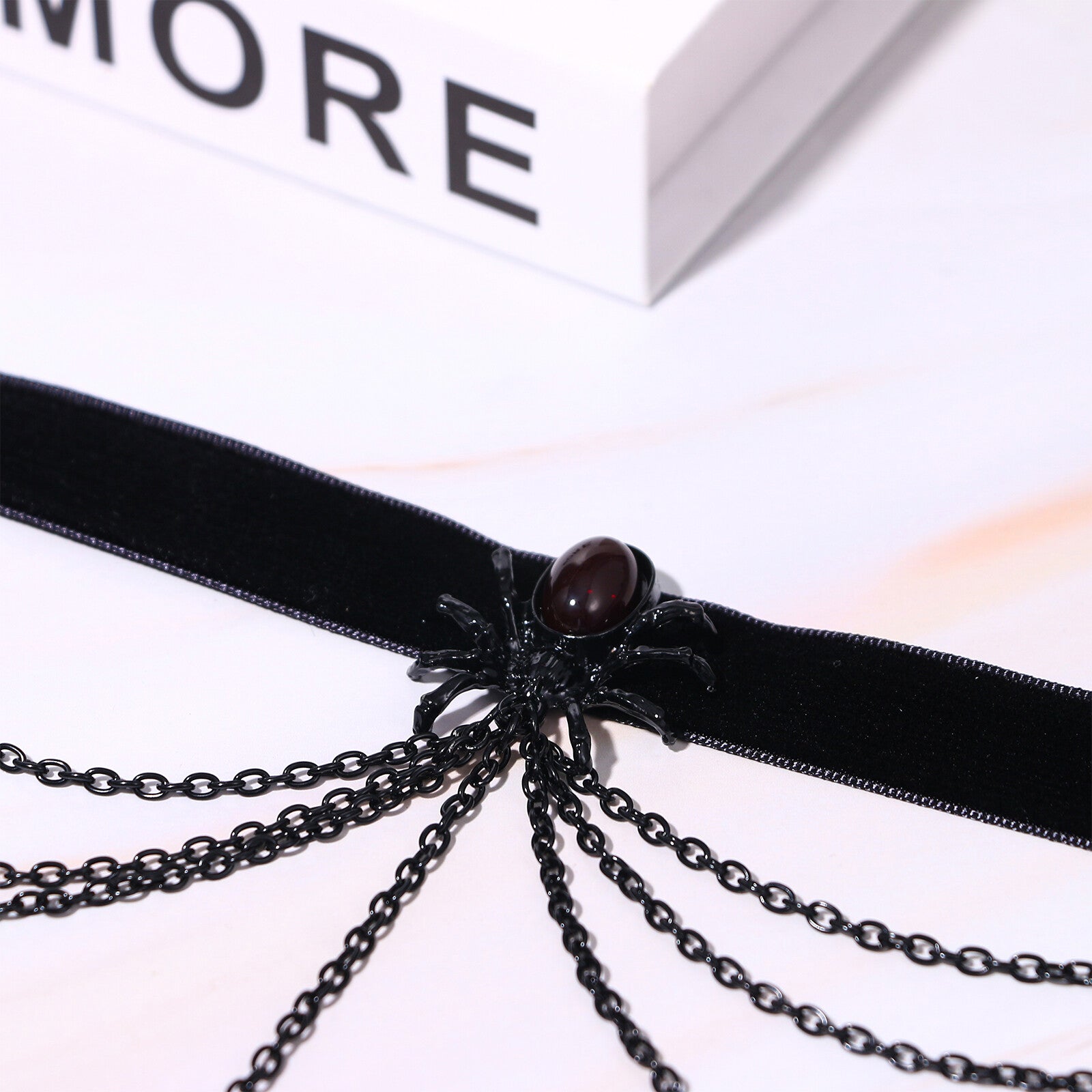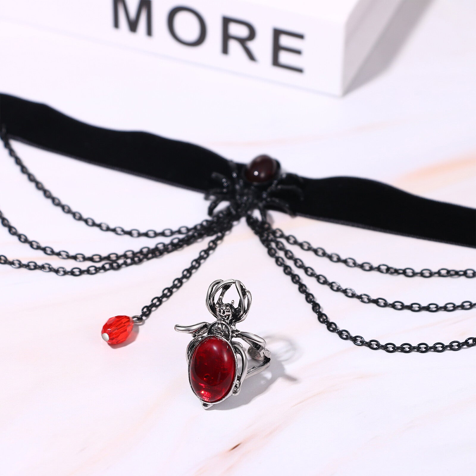 Boniskiss Women Tassel Spider Necklace Ring Set - Halloween Retro Gothic Red Crystal Pendant Necklace Ring Jewelry Set