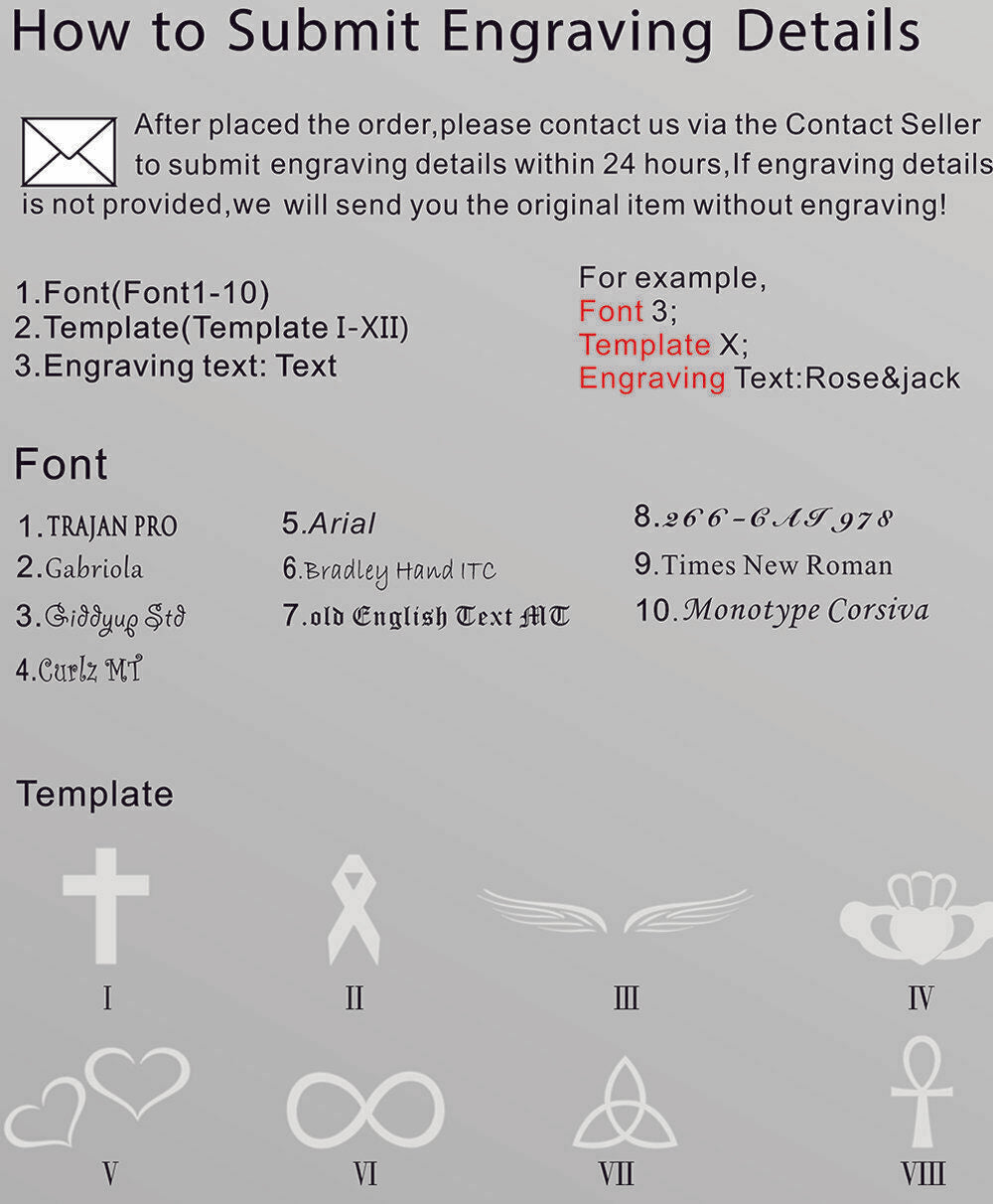 Please click the "Chat" button in the lower right corner or send the engraving content to our customer service at boniskiss@gmail.com