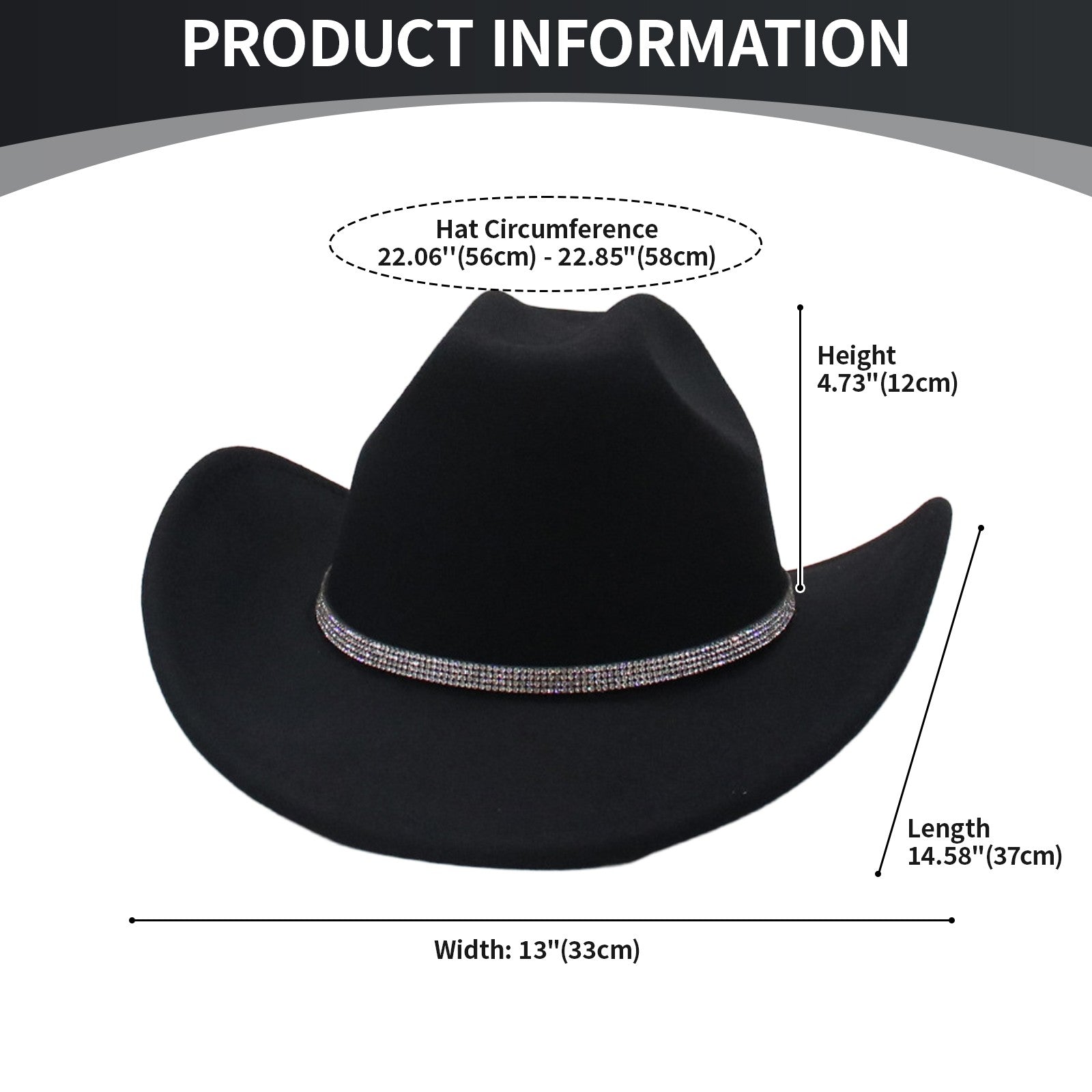 Made of polyester fabric that mimics wool felt, the hat is warm, stiff and shape-retaining, keeping its elegant form even after long-term use. Adorned with multiple rows of rhinestone hatbands, it adds a brilliant and glamorous touch to your look. The classic Western-style wide curved brim not only modifies your face shape but also provides effective sun protection, combining beauty and practicality.